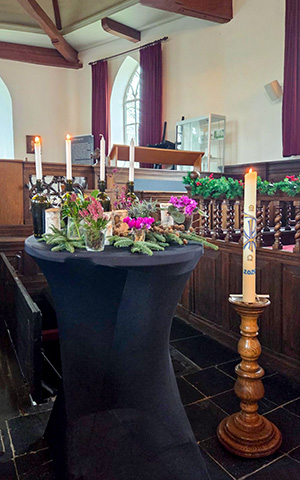 Vier kandelaars met kaarsen staan opgesteld. Tussen de eerste en tweede kandelaar zweven nu twee duiven.