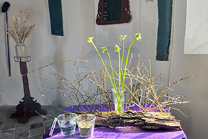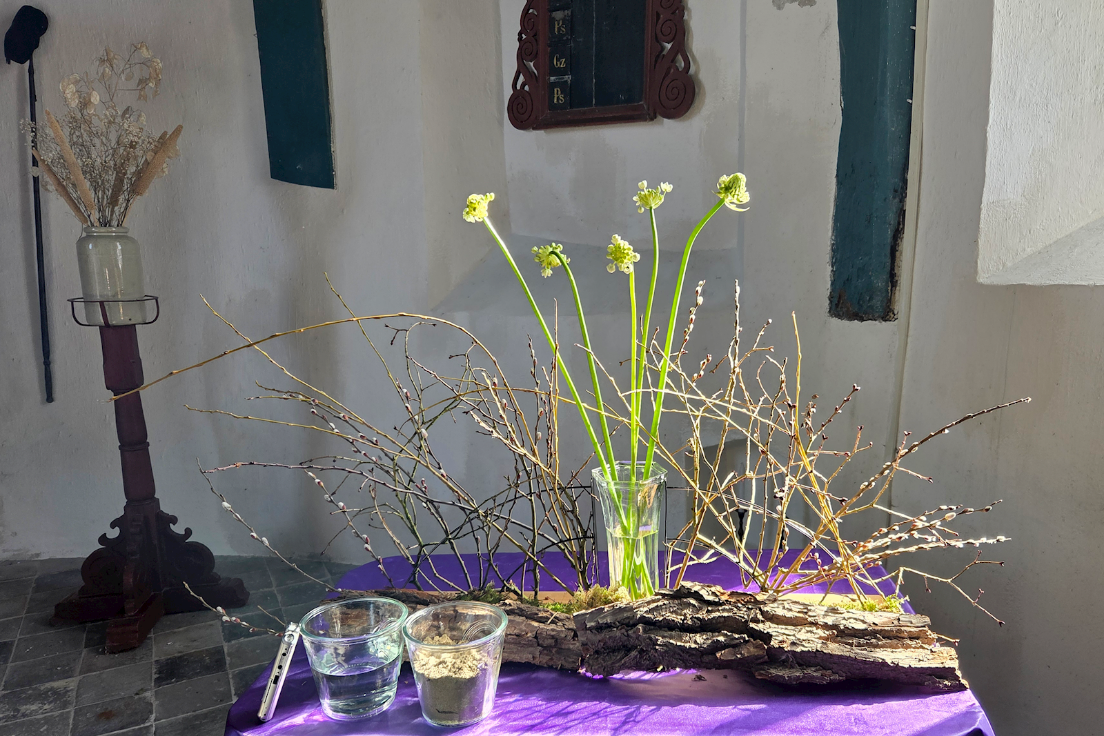 De grote vaas wordt gevuld met water, bloemen en wilgentakken. Zand en stenen benadrukken de berg.