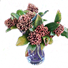 De geurende bloeiende bloemen van de skimmia in de kleine vaas, versterken de onverwachte vreugde.