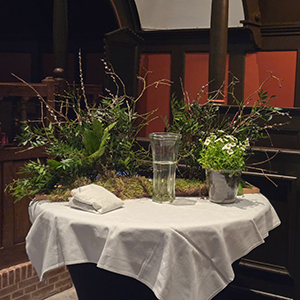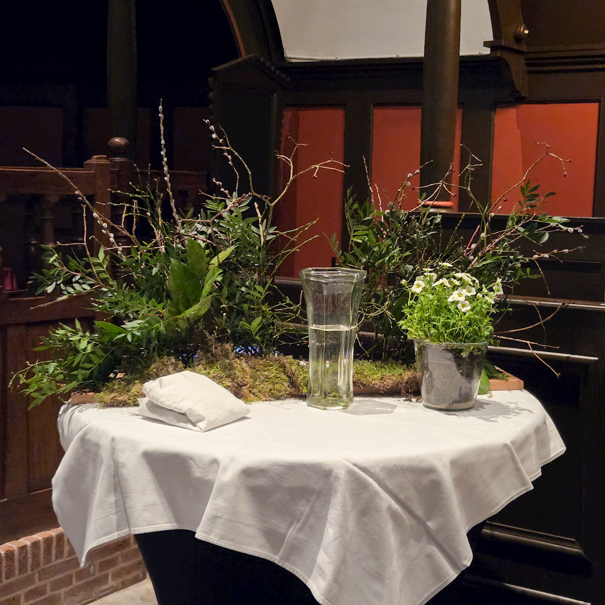 De voetwassing wordt gesymboliseerd met water, een (linnen) doek en bloeiende viooltjes.