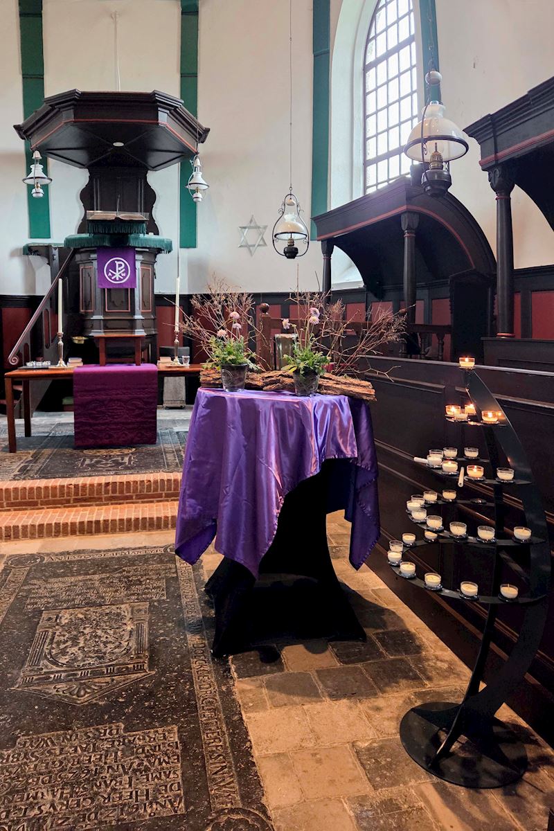 Het donker is doorbroken, het paars verzacht, een feestelijke kleur gloeit op. Drie kaarsen branden.